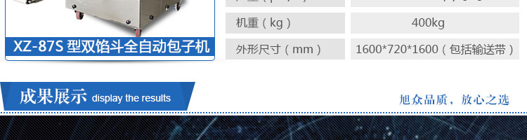 名稱XZ-87S型雙餡斗全自動包子機 電源220/380V(見機器名牌) 功率2.4kw 產量0-3600個/小時 尺寸1600*720*1600mm(包括輸送帶) 重量400kg 規(guī)格20-150克/個 其他