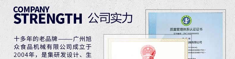 廣州旭眾食品機(jī)械有限公司是一家集科研開(kāi)發(fā),生產(chǎn)設(shè)計(jì),營(yíng)銷服務(wù)為一體的現(xiàn)代化生產(chǎn)企業(yè)?,F(xiàn)代化生產(chǎn)車間,精湛制造技術(shù),所產(chǎn)機(jī)械歷經(jīng)市場(chǎng)重重考驗(yàn),不斷贏得海內(nèi)外客戶的贊譽(yù)。
