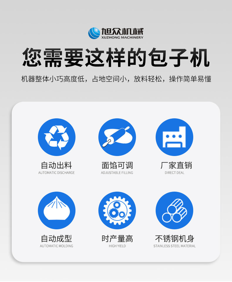 作者:旭眾機械發(fā)布時間:2021-04-26 17:44查看數(shù):您當前的位置:首頁>>產(chǎn)品展示>>面制品加工系列>>包子機系列