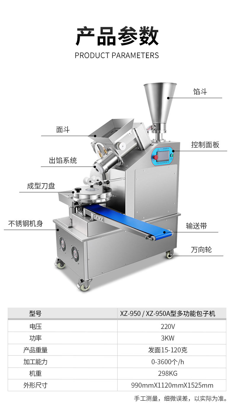 名稱XZ-950型多功能包子機 電源220V 功率3KW 產(chǎn)量0-3600個/h 尺寸990mmxl120mmx1525mm 重量298KG 規(guī)格發(fā)面15-120克 其他