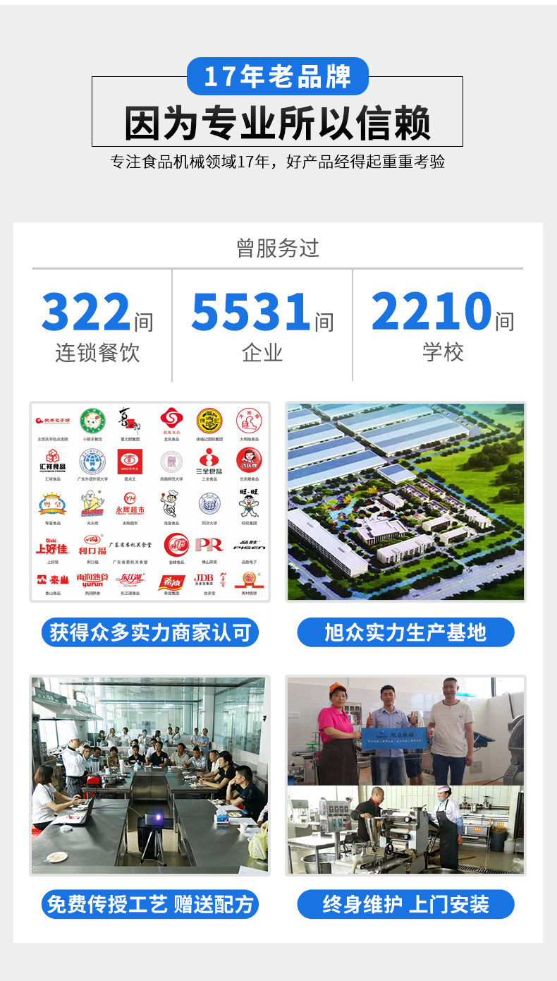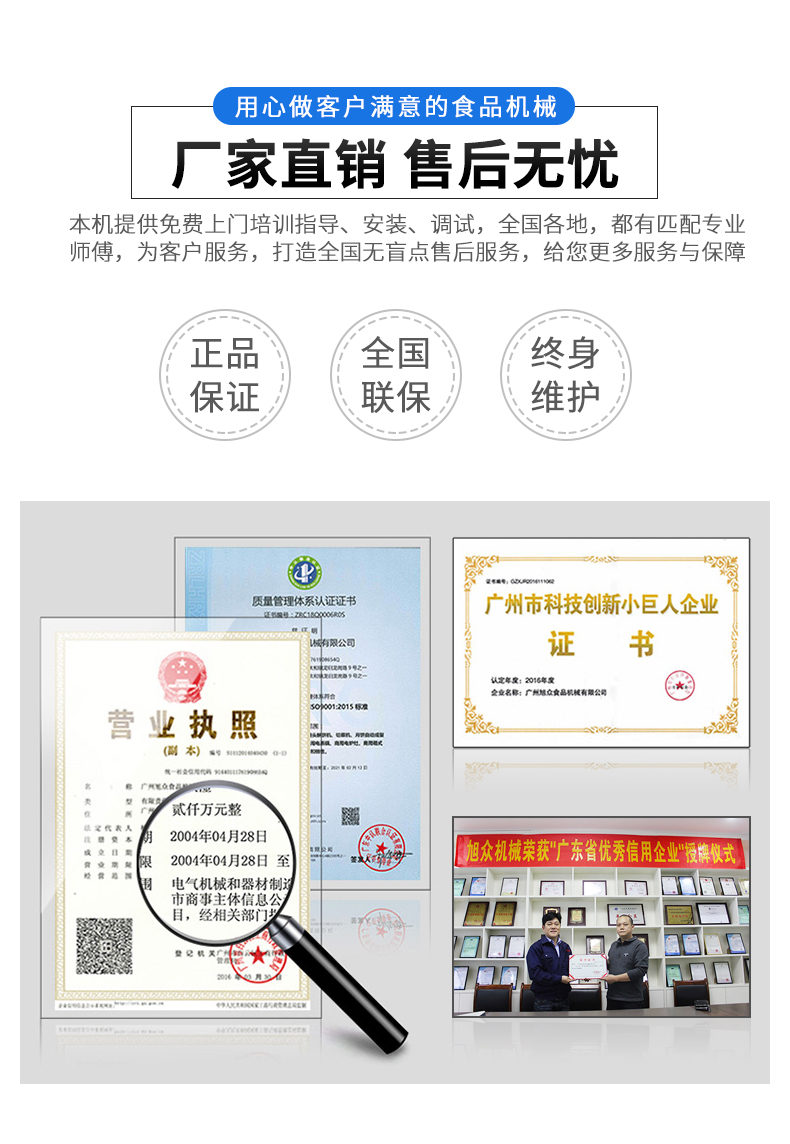 廣州旭眾食品機械有限公司是一家集科研開發(fā),生產(chǎn)設計,營銷服務為一體的現(xiàn)代化生產(chǎn)企業(yè)?,F(xiàn)代化生產(chǎn)車間,精湛制造技術,所產(chǎn)機械歷經(jīng)市場重重考驗,不斷贏得海內(nèi)外客戶的贊譽。