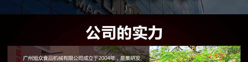 廣州旭眾食品機(jī)械有限公司是一家集科研開發(fā),生產(chǎn)設(shè)計(jì),營銷服務(wù)為一體的現(xiàn)代化生產(chǎn)企業(yè)。現(xiàn)代化生產(chǎn)車間,精湛制造技術(shù),所產(chǎn)機(jī)械歷經(jīng)市場重重考驗(yàn),不斷贏得海內(nèi)外客戶的贊譽(yù)。