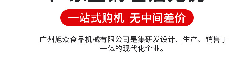 廣州旭眾食品機(jī)械有限公司是一家集科研開發(fā),生產(chǎn)設(shè)計(jì),營銷服務(wù)為一體的現(xiàn)代化生產(chǎn)企業(yè)。現(xiàn)代化生產(chǎn)車間,精湛制造技術(shù),所產(chǎn)機(jī)械歷經(jīng)市場重重考驗(yàn),不斷贏得海內(nèi)外客戶的贊譽(yù)。