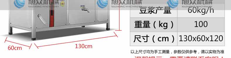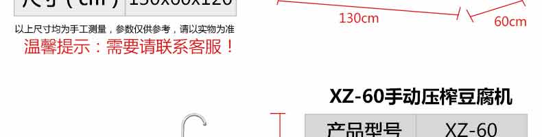 名稱xz-61手動帶攪拌花生豆腐機 電源220V 功率磨漿1.1KW,煮漿12KW 產(chǎn)量豆腐產(chǎn)量50KG/H,豆?jié){產(chǎn)量100KG/H 尺寸尺寸140*60*120mm 重量重量100KG 規(guī)格 其他