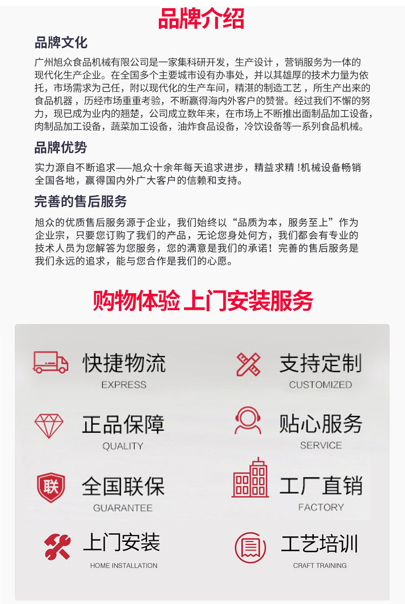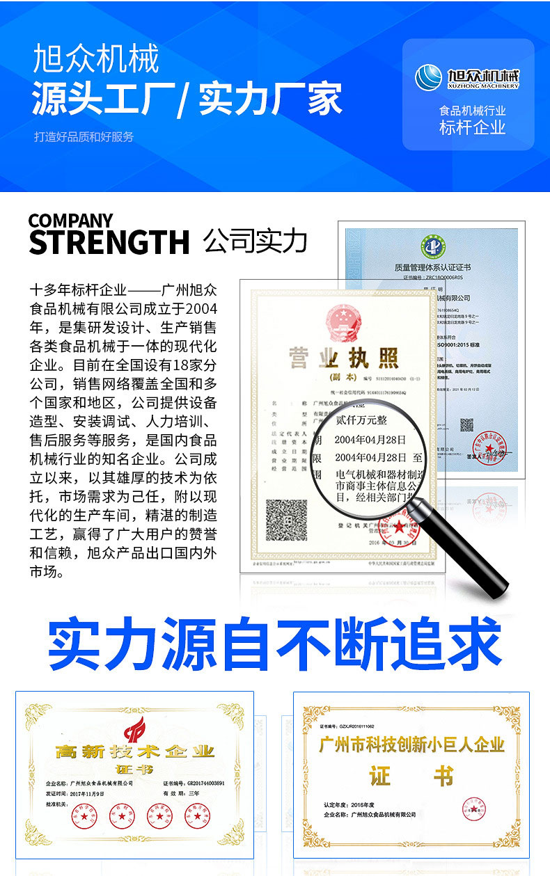 廣州旭眾食品機(jī)械有限公司是一家集科研開(kāi)發(fā),生產(chǎn)設(shè)計(jì),營(yíng)銷服務(wù)為一體的現(xiàn)代化生產(chǎn)企業(yè)?,F(xiàn)代化生產(chǎn)車間,精湛制造技術(shù),所產(chǎn)機(jī)械歷經(jīng)市場(chǎng)重重考驗(yàn),不斷贏得海內(nèi)外客戶的贊譽(yù)。