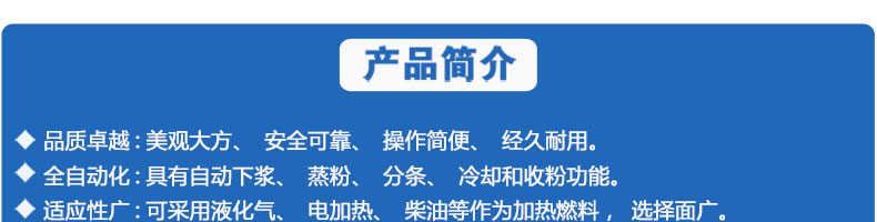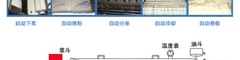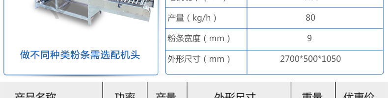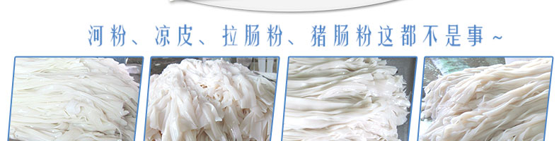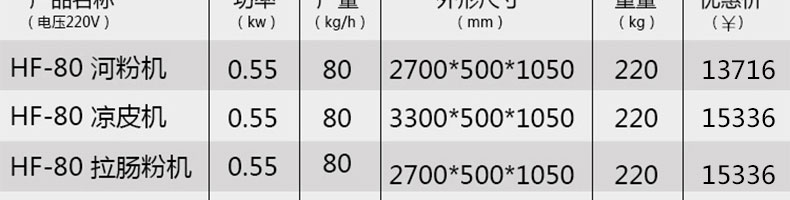 名稱SZ-HF-80高效節(jié)能河粉機 電源220/380V 功率0.75/22kw 產(chǎn)量24/36/48/60kg/h 尺寸主機尺寸2700*500*1050mm 外形尺寸2800*700*1500mm 重量220kg 規(guī)格粉條寬度mm:4/6/8/10 其他