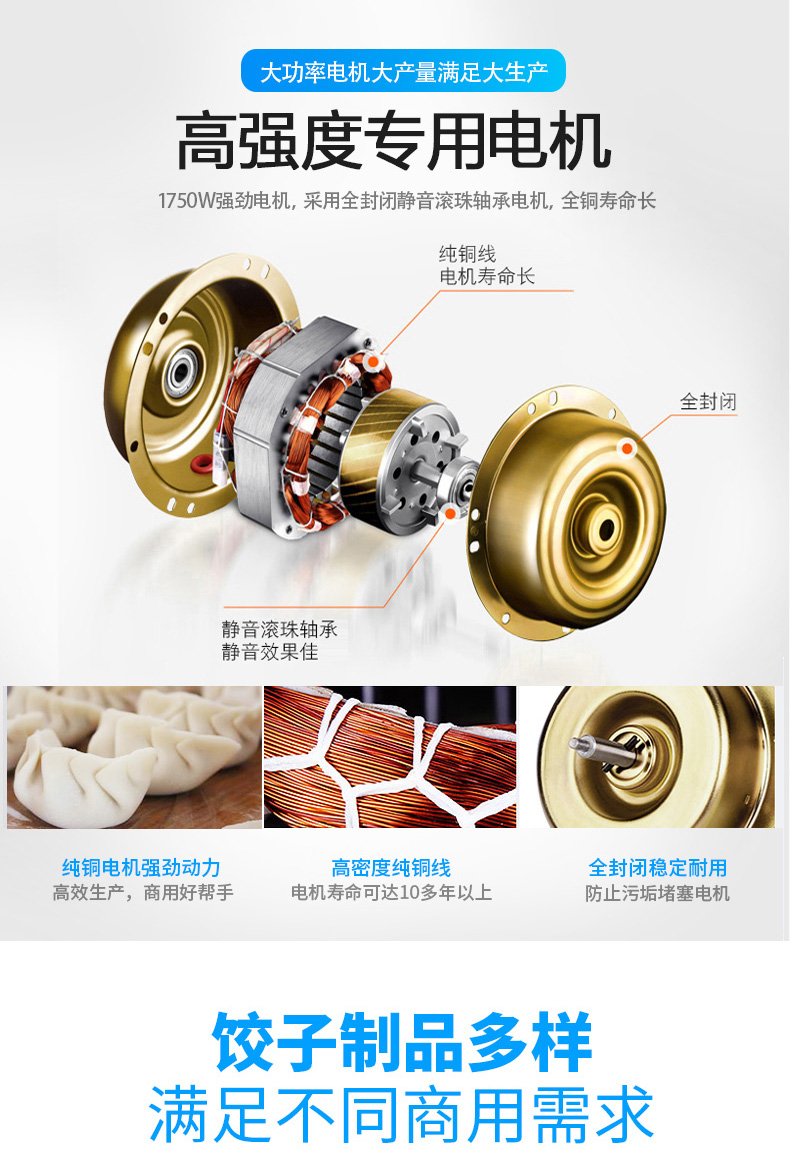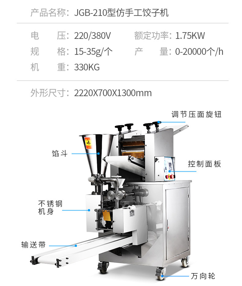 名稱JGB-210型仿手工餃子機(jī) 電源220/380V(見(jiàn)機(jī)器名牌) 功率1.75kw 產(chǎn)量0-20000個(gè)/小時(shí) 尺寸外形尺寸2220*700*1300mm 重量330kg 規(guī)格15-35克/個(gè) 其他