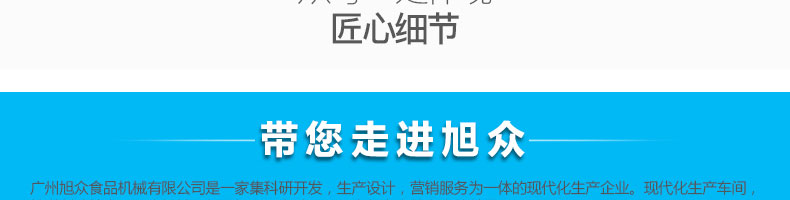 廣州旭眾食品機(jī)械有限公司是一家集科研開(kāi)發(fā),生產(chǎn)設(shè)計(jì),營(yíng)銷服務(wù)為一體的現(xiàn)代化生產(chǎn)企業(yè)?,F(xiàn)代化生產(chǎn)車間,精湛制造技術(shù),所產(chǎn)機(jī)械歷經(jīng)市場(chǎng)重重考驗(yàn),不斷贏得海內(nèi)外客戶的贊譽(yù)。