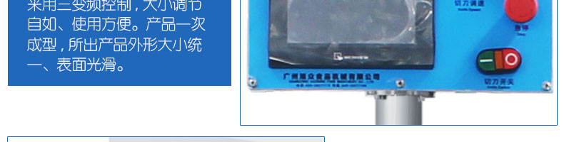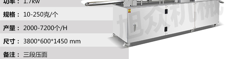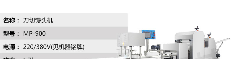 名稱MP900型刀切饅頭成型機(jī) 電源220/380V(見機(jī)器名牌) 功率1.7kw 產(chǎn)量2000-7200個(gè)/小時(shí) 尺寸3800*600*1450mm 重量450kg 規(guī)格10-250克/個(gè) 其他三段壓面