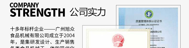 廣州旭眾食品機械有限公司是一家集科研開發(fā),生產設計,營銷服務為一體的現代化生產企業(yè)?,F代化生產車間,精湛制造技術,所產機械歷經市場重重考驗,不斷贏得海內外客戶的贊譽。