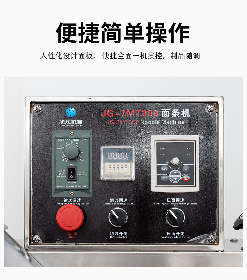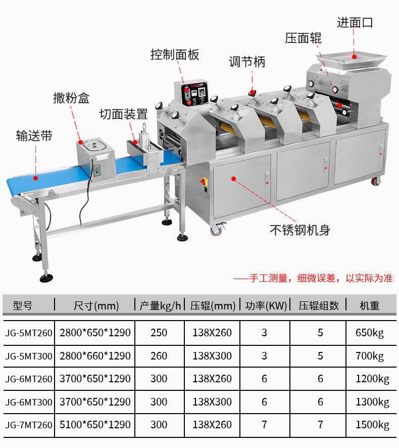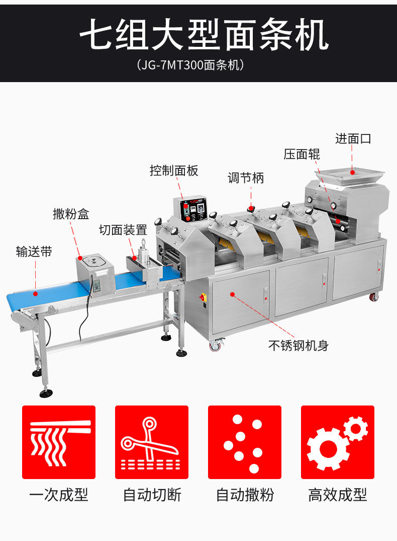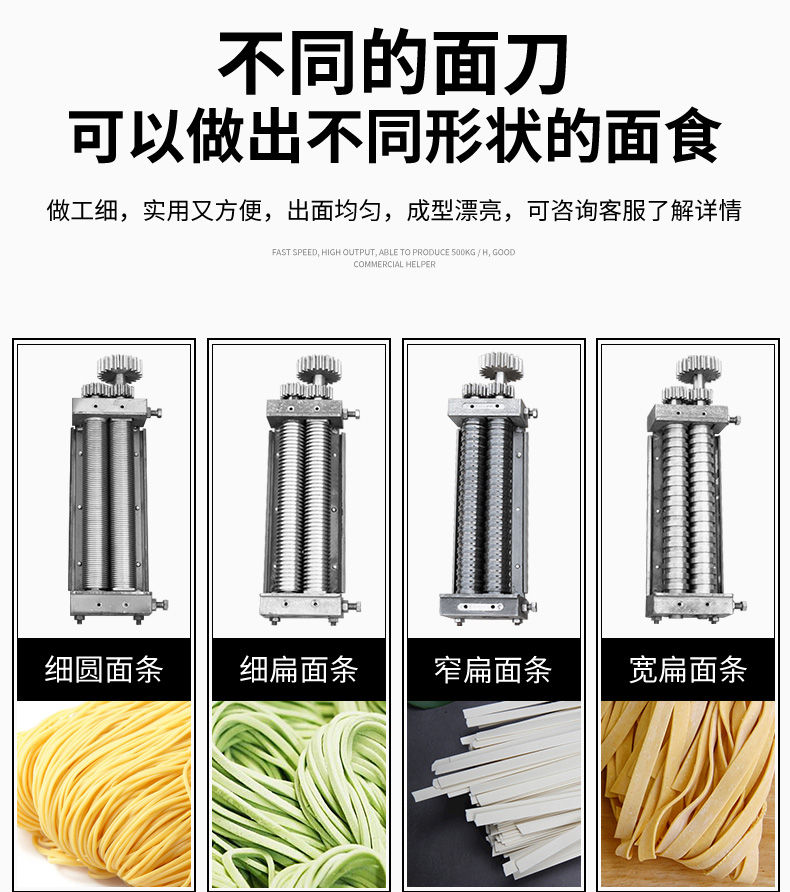 JG-7MT300面條機,多種功能一機搞定比傳統(tǒng)手工做面條,省時省力??梢宰鍪裁歹r面、蔬菜面、掛面、圓面、寬面、刀削面、波浪面等。不同的面刀可以做出不同形狀的面食做工細,實用又方便,出面均勻,成型漂亮。