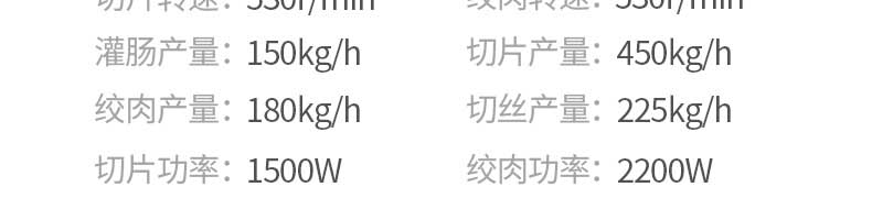 名稱(chēng)XZ-7絞切機(jī) 電源220V 功率切片功率:1500W、絞肉功率:2200W 產(chǎn)量灌腸:150kg/h、切片:450kg/h、絞肉:180kg/h、切絲:225kg/h 尺寸600×440X820mm 重量93KG 規(guī)格聯(lián)系銷(xiāo)售員 其他切片轉(zhuǎn)速:530/mn、絞肉轉(zhuǎn)速:530r/min