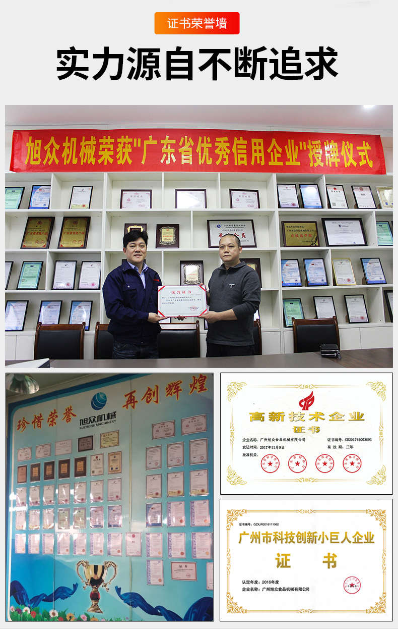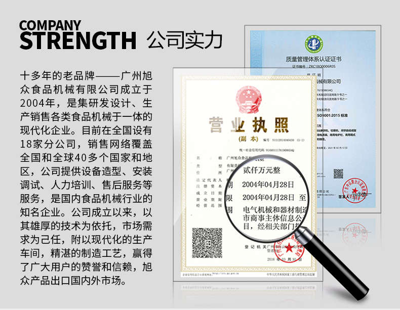 廣州旭眾食品機械有限公司是一家集科研開發(fā),生產(chǎn)設計,營銷服務為一體的現(xiàn)代化生產(chǎn)企業(yè)。現(xiàn)代化生產(chǎn)車間,精湛制造技術,所產(chǎn)機械歷經(jīng)市場重重考驗,不斷贏得海內(nèi)外客戶的贊譽。
