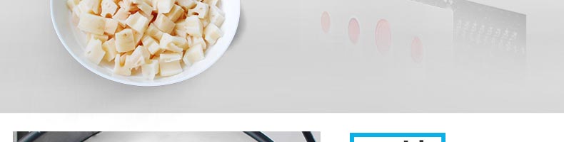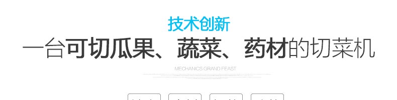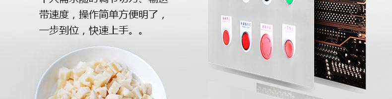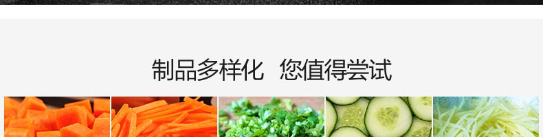名稱XZ-680A多功能切菜機(jī) 電源220/380V(見機(jī)器銘牌) 功率1.3kw 產(chǎn)量300-1000千克/小時 尺寸1220*530*1280mm 重量140kg 規(guī)格標(biāo)配刀具尺寸:切絲:3mm,切片:3mm,切?。?0*10mm。可選的刀具尺寸:切絲:4、5、6mm 其他