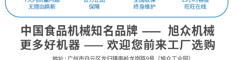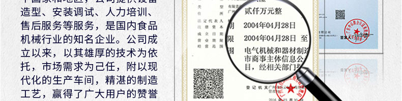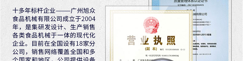 廣州旭眾食品機(jī)械有限公司是一家集科研開(kāi)發(fā),生產(chǎn)設(shè)計(jì),營(yíng)銷服務(wù)為一體的現(xiàn)代化生產(chǎn)企業(yè)?,F(xiàn)代化生產(chǎn)車間,精湛制造技術(shù),所產(chǎn)機(jī)械歷經(jīng)市場(chǎng)重重考驗(yàn),不斷贏得海內(nèi)外客戶的贊譽(yù)。