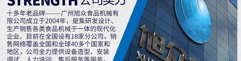 廣州旭眾食品機(jī)械有限公司是一家集科研開發(fā),生產(chǎn)設(shè)計(jì),營銷服務(wù)為一體的現(xiàn)代化生產(chǎn)企業(yè)。現(xiàn)代化生產(chǎn)車間,精湛制造技術(shù),所產(chǎn)機(jī)械歷經(jīng)市場(chǎng)重重考驗(yàn),不斷贏得海內(nèi)外客戶的贊譽(yù)。
