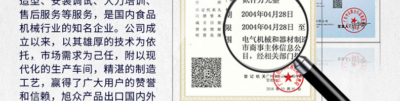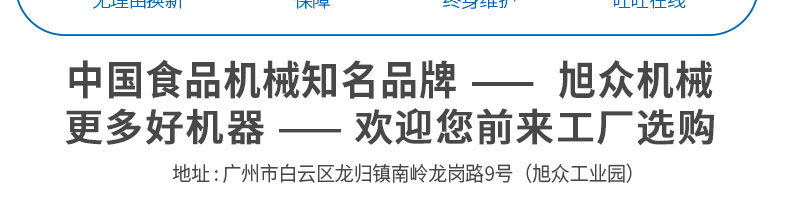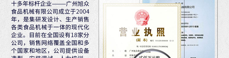 廣州旭眾食品機(jī)械有限公司是一家集科研開(kāi)發(fā),生產(chǎn)設(shè)計(jì),營(yíng)銷(xiāo)服務(wù)為一體的現(xiàn)代化生產(chǎn)企業(yè)。現(xiàn)代化生產(chǎn)車(chē)間,精湛制造技術(shù),所產(chǎn)機(jī)械歷經(jīng)市場(chǎng)重重考驗(yàn),不斷贏得海內(nèi)外客戶(hù)的贊譽(yù)。