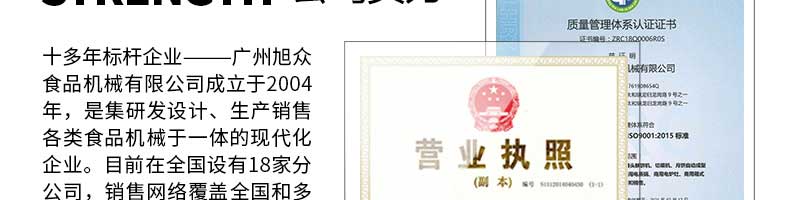 廣州旭眾食品機(jī)械有限公司是一家集科研開發(fā),生產(chǎn)設(shè)計(jì),營(yíng)銷服務(wù)為一體的現(xiàn)代化生產(chǎn)企業(yè)?,F(xiàn)代化生產(chǎn)車間,精湛制造技術(shù),所產(chǎn)機(jī)械歷經(jīng)市場(chǎng)重重考驗(yàn),不斷贏得海內(nèi)外客戶的贊譽(yù)。