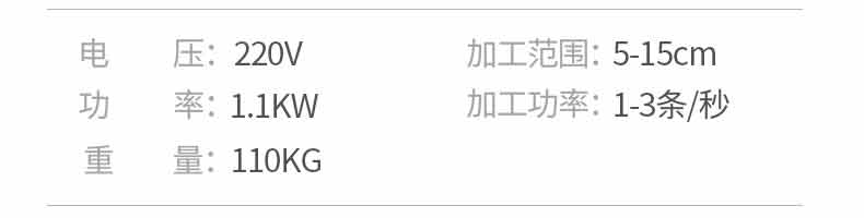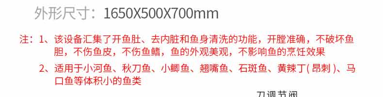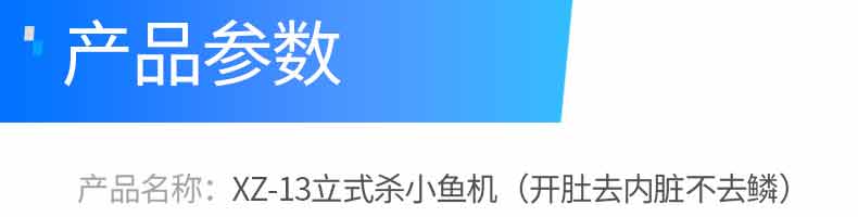 名稱XZ-13型立式小殺魚機(jī)(開肚不去鱗) 電源220V 功率1.1kw 產(chǎn)量1-3條/秒 尺寸1650x500x700mm 重量110kg 規(guī)格 其他殺魚范圍 5-15cm