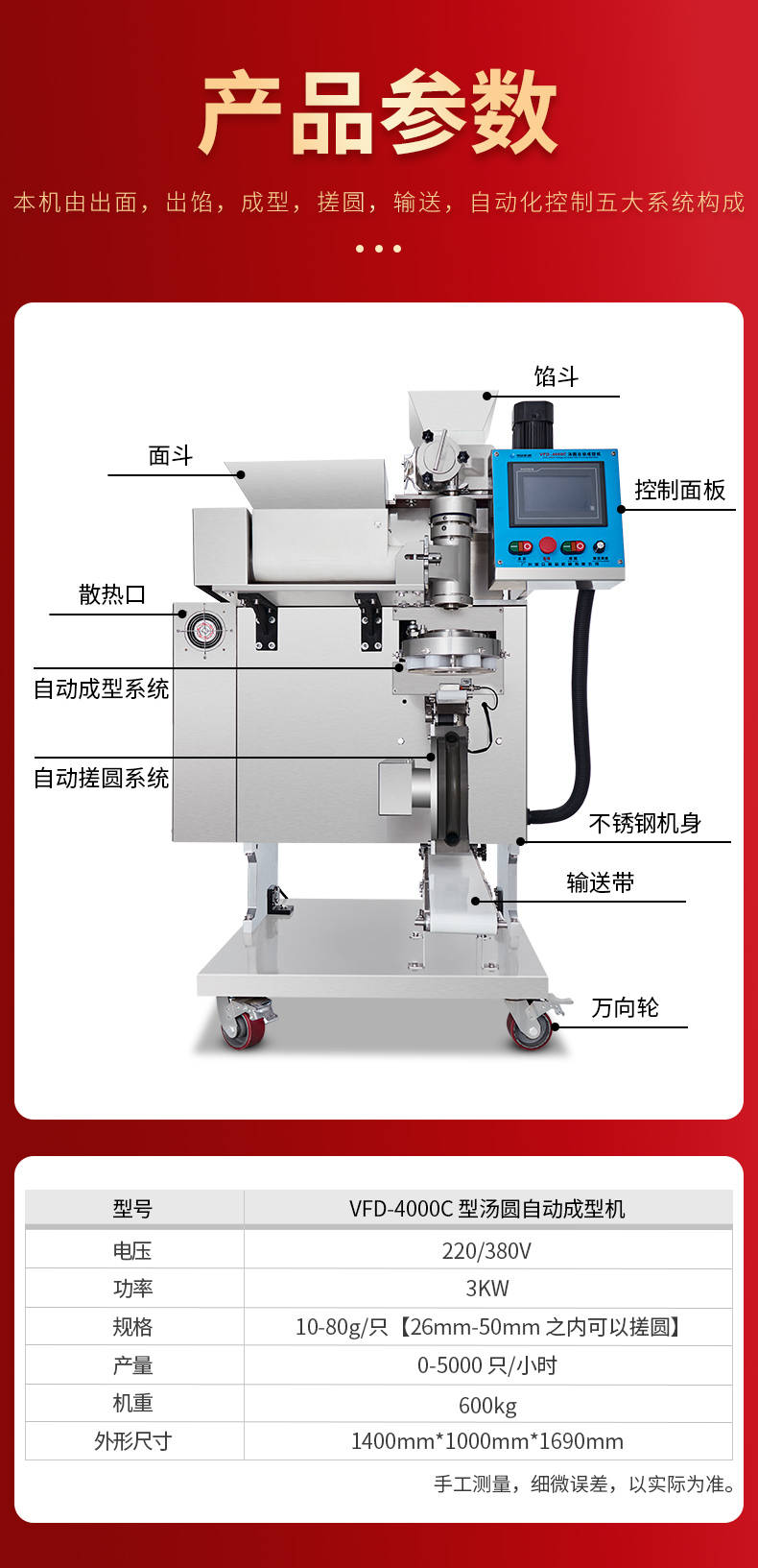 名稱VFD-4000型湯圓自動成型排盤一體機 電源220/380V(見機器名牌) 功率3KW 產(chǎn)量0-5000只 尺寸1400mm*1000mm*1690mm 重量600kg 規(guī)格10-80g/只【26mm-50mm之內(nèi)可以搓圓】 其他