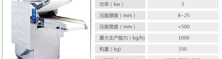 名稱500自動壓面機系列 電源220/380V 220/380V 380V 功率1.5kw 1.5KW 3kw 產(chǎn)量 尺寸外形尺寸570*670*1110mm 620*670*1110mm 750*780*1180mm 重量120kg 125kg 320kg 規(guī)格 其他