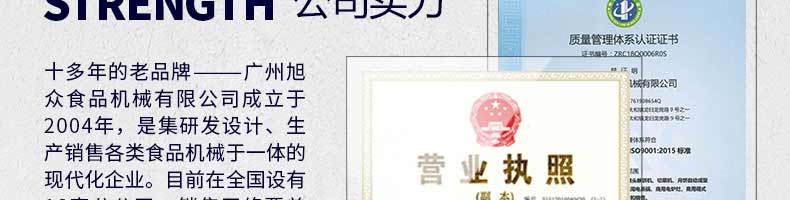 廣州旭眾食品機(jī)械有限公司是一家集科研開發(fā),生產(chǎn)設(shè)計(jì),營(yíng)銷服務(wù)為一體的現(xiàn)代化生產(chǎn)企業(yè)?,F(xiàn)代化生產(chǎn)車間,精湛制造技術(shù),所產(chǎn)機(jī)械歷經(jīng)市場(chǎng)重重考驗(yàn),不斷贏得海內(nèi)外客戶的贊譽(yù)。