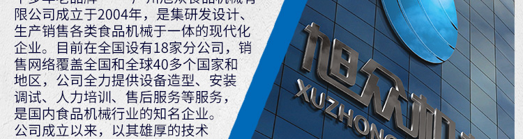 廣州旭眾食品機械有限公司是一家集科研開發(fā),生產(chǎn)設(shè)計,營銷服務(wù)為一體的現(xiàn)代化生產(chǎn)企業(yè)。現(xiàn)代化生產(chǎn)車間,精湛制造技術(shù),所產(chǎn)機械歷經(jīng)市場重重考驗,不斷贏得海內(nèi)外客戶的贊譽。